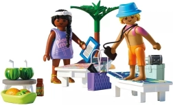 Krenite za suncem s PLAYMOBIL setom koji donosi opuštenu ljetnu priču. Dvojac uživa u relaksu na ležaljkama u hladu palme, pijucka osvježavajuće napitke i gricka sočno voće. Zahvaljujući UV reaktivnom tisku na muškoj figurici, na stvarnom sunčevom svjetlu pojavljuje se efekt opeklina – sjajan i poučan detalj za djecu.