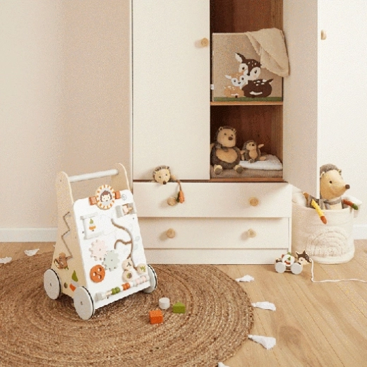 Drvena dječja hodalica Bieco s 8 aktivnosti. Stabilna, sigurna, protuklizni kotači, kvalitetno drvo. Za djecu od 12 mjeseci. Dizajn šumskih životinja.