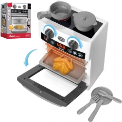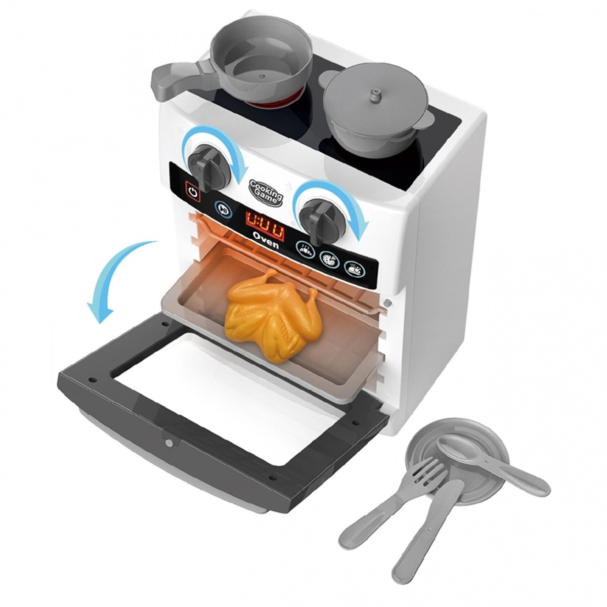 Otkrijte zabavnu dječju kuhinjicu s pećnicom koja svijetli i reproducira realistične zvukove poput pravih kućanskih uređaja. Dovoljno je pritisnuti tipku ON, odabrati jedan od tri načina rada i igra može početi – pećnica se osvijetli a kuhinjica pusti autentične zvučne efekte. Dva plamenika i dvije okretne tipke s klikom pojačavaju dojam pravog kuhanja. U paketu je i bogata dodatna oprema za pripremu „slasnih” jela.