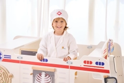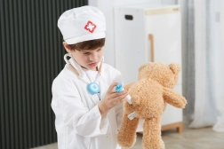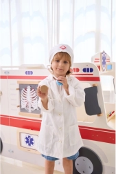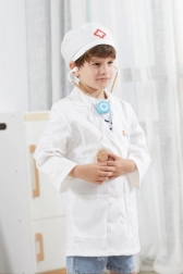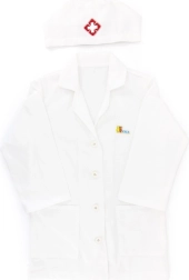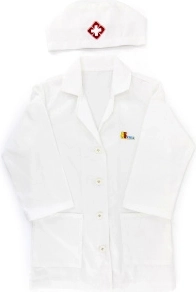 Bijeli ogrtač i kapa s medicinskim simbolom potiču dječju maštu i daju igri dozu stvarnosti.