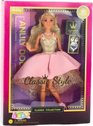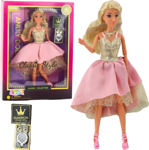 Elegantna lutka u balskoj haljini razveselit će svaku malu ljubiteljicu mode. Visoka je oko 30 cm, nosi raskošnu haljinu u pastelnim bojama sa zlatnom čipkom i stilske dodatke – ogrlicu, naušnice i elegantne cipelice. Odlična za igru uloga, potiče maštu, kreativnost i društvene vještine.