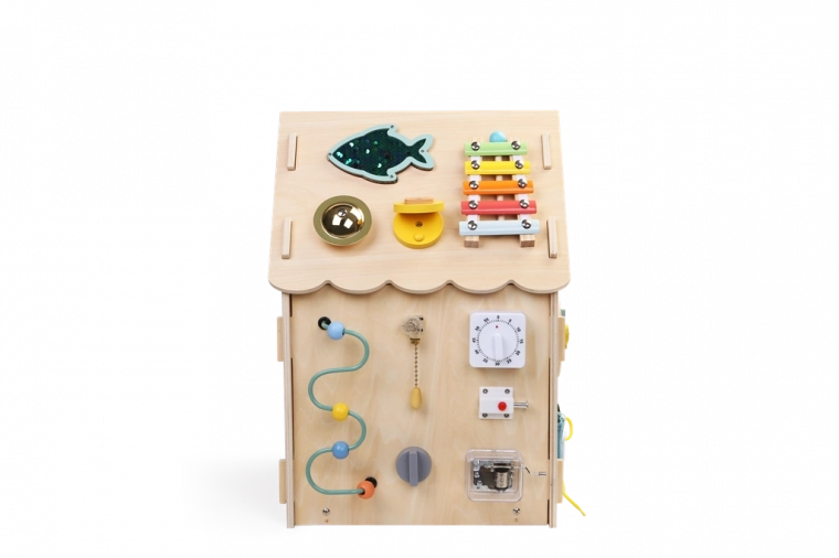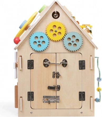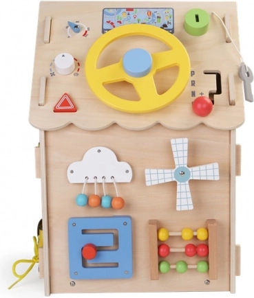 Otkrijte drvenu aktivnu kućicu punu igara i učenja za djecu od 3 godine. Svaka strana nudi interaktivne elemente koji razvijaju finu motoriku, logičko razmišljanje i senzornu percepciju. Djeca će uživati u volanu i ručici mjenjača, zupčanicima, labirintu s kuglicom, abaku te vježbanju bravica, patentnog zatvarača, gumba i vezanja vezica. Sigurna izrada od kvalitetnog prirodnog drva i netoksičnih boja.