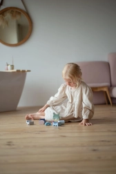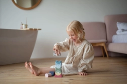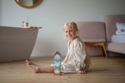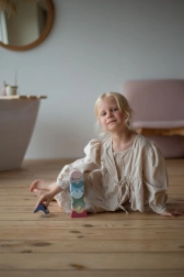 Ova pasteljna balansirajuća kula nudi 11 precizno obrađenih drvenih dijelova koji moraju pravilno međusobno pristajati. Zahvaljujući zaobljenim oblicima i promišljenoj konstrukciji kulu nije moguće samo slagati okomito, već je i sigurno nagnuti na obje strane te tako trenirati strpljenje i finu motoriku.