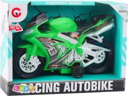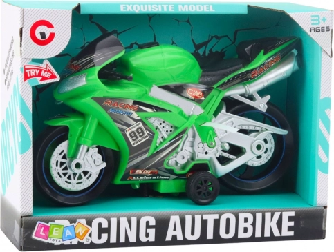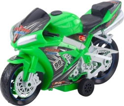 Ova zelena trkaća motorna igračka razveselit će sve male ljubitelje brzine i moto utrka. Izrađena je od izdržljive plastike, ima stabilno postolje i široke kotače za sigurnu vožnju po raznim podlogama. Pritiskom na gumb pokreću se svjetlosni efekti i realistični zvukovi motora koji pojačavaju doživljaj igre.