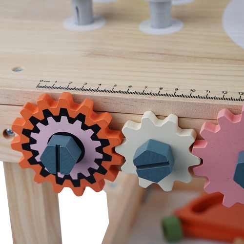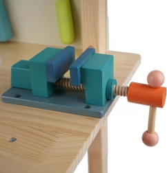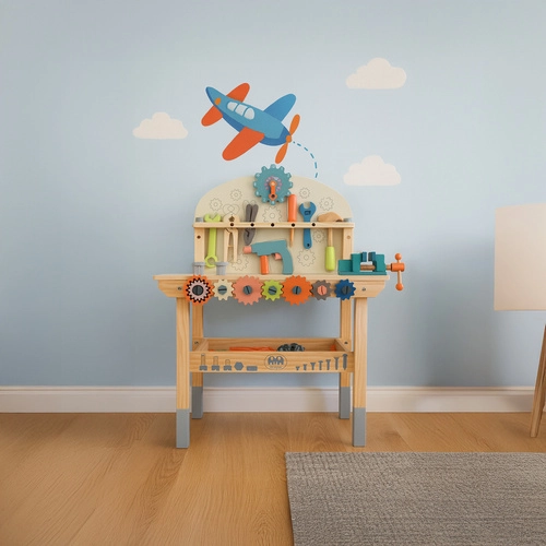 Dječji drveni stol za radionicu KRUZZEL donosi kompletnu majstorsku stanicu za male stručnjake za vijke. Stol s integriranim stegom, mjerilom i unaprijed izbušenim otvorima omogućuje stvaran „rad” u sigurnom okruženju. Prirodni, netoksični materijali i zaobljeni rubovi osiguravaju sigurnu igru, dok stabilna konstrukcija odolijeva svakodnevnim pustolovinama.