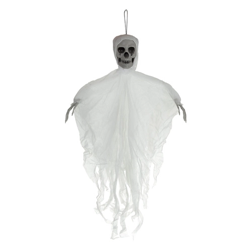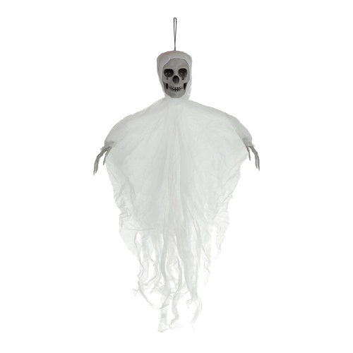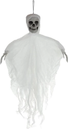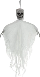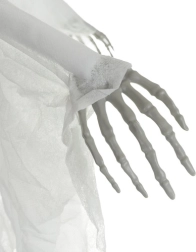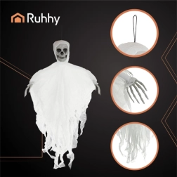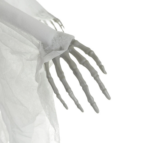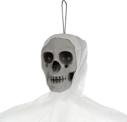 Realističan viseći kostur s lubanjom i poderanom tkaninom odmah stvara jezivu atmosferu. Lagana konstrukcija i omčica za vješanje omogućuju lako postavljanje na strop, vrata ili luster, ali i u natkrivene vanjske prostore. Pokretna tkanina stvara efekt lebdeće prikaze, a veća dimenzija 70 cm osigurava da postane središte pozornosti. Odlično za Noć vještica, tematske zabave i scenografiju.