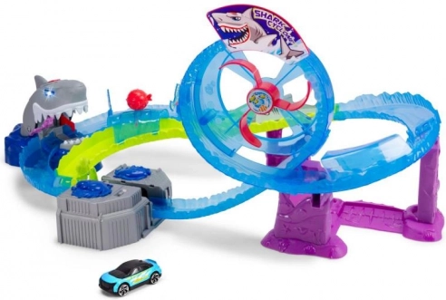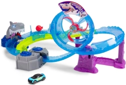 Autostaza impresionira i svjetlosnim efektima te jezivim podvodnim zvukovima, uključujući riku morskog psa, koji pojačavaju atmosferu igre. U pakiranju se nalazi metalni autić, pa možete započeti utrkivanje odmah nakon otvaranja.