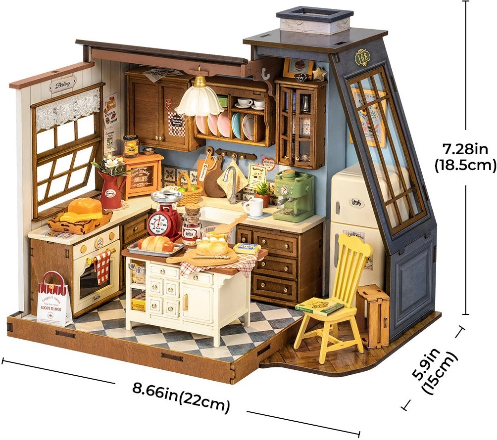 Ova detaljno izrađena minijaturna kućica donosi ugođaj dobre stare kuhinje. U njoj ćete pronaći ugradbene drvene ormariće, starinsku vagu, aparat za kavu, blistavo bijele radne ploče i retro žutu stolicu. Veliki prozori – jedan s europskim kosim ostakljenjem, a drugi s nadstrešnicom i zavjesom – daju sceni i svjetlo i čar. LED osvjetljenje dodatno naglašava topli štih domaće atmosfere.