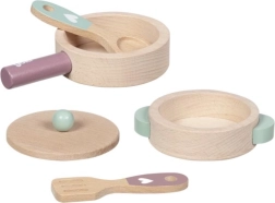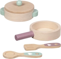 Ovaj drveni kuhinjski set razveselit će sve male kuhare. Tava i lonac s poklopcem izrađeni su od izdržljive bukovine, koja podnosi i svakodnevne „kulinarske eksperimente“. Zahvaljujući čvrstoj izradi i glatkim rubovima igra je sigurna i ugodna na dodir.