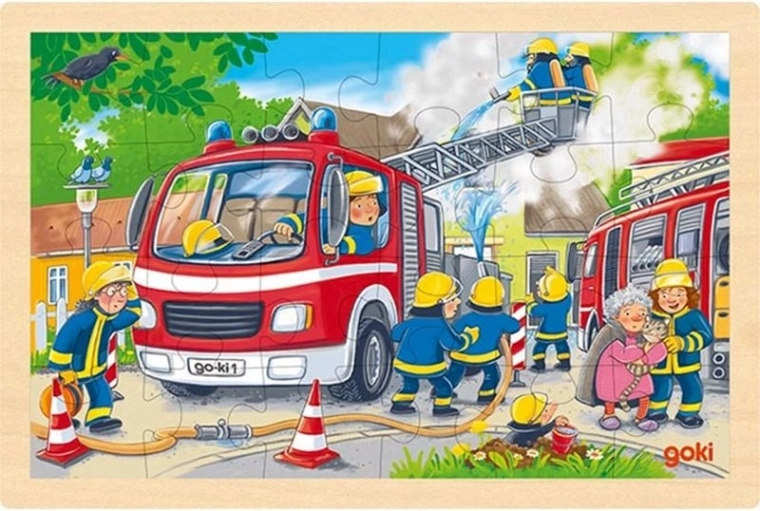 Otkrijte kvalitetne drvene puzzle s motivom vatrogasne intervencije brenda GOKI. Puzzle s 24 dijela smještene su na drvenoj ploči s urezanim rubom za lakše slaganje. Ispod pojedinih dijelova skriva se dodatna slika koja će djecu iznenaditi i motivirati. Slaganje razvija finu motoriku, koncentraciju i maštu.