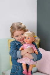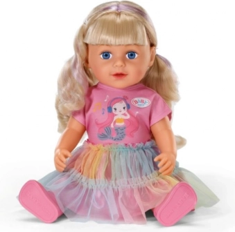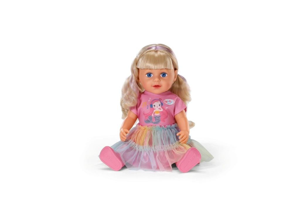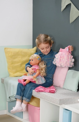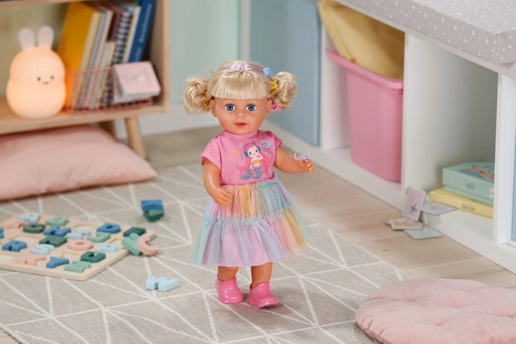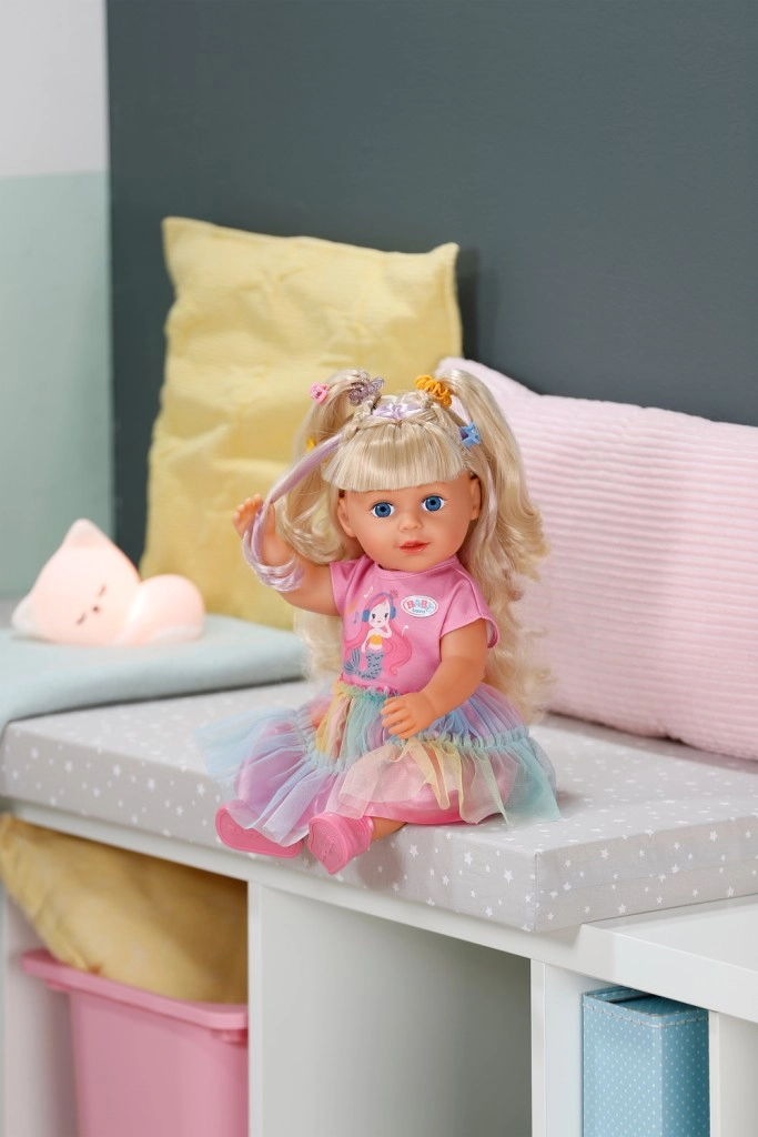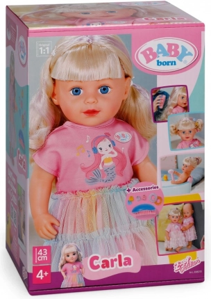 Otkrijte lutku BABY born Carla 43 cm s dugom kvalitetnom najlonskom kosom koja se odlično češlja. U kompletu je 7 dodataka za uređivanje frizure, lutka ima pokretne zglobove, može stajati sama i zahvaljujući čvrstom tjelešcu može se kupati u kadi. Stil upotpunjuju slatka majica, duga suknja od duge od tila i ružičaste cipele – savršeno za kreativnu igru i stiliziranje kose.