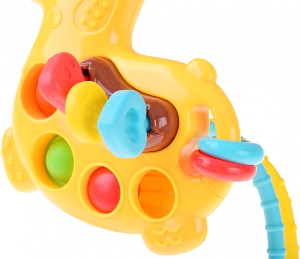 Mini žirafa nudi raznoliku senzornu stimulaciju: dijete može pritiskati pop it mjehuriće, pomicati perlice ili provlačiti mekane izbočine kroz tijelo žirafe. Mekan, siguran materijal nježno masira desni i pomaže pri nicanju zubića, dok šareni i zvučni efekti potiču fokus i znatiželju.