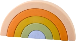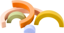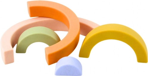 Pastelni dugin građevni set od gume izvrsna je osjetilna igračka za najmlađe. Potpomaže kreativnost, logičko razmišljanje i koordinaciju pokreta. Pet mekanih dijelova različitih veličina može se slobodno slagati i kombinirati u brojne konstrukcije. Sigurne, meke i elastične kocke bez oštrih rubova jamče ugodnu i sigurnu igru.