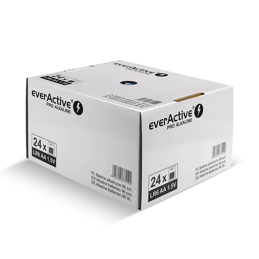 Paket everActive PRO Alkaline donosi najjaču liniju alkalnih baterija marke everActive u praktičnom display pakiranju – 24 blistera po 4 komada, ukupno 96 baterija AA (LR6). Idealno za maloprodaju, servisne centre, tvrtke i profesionalnu upotrebu.