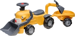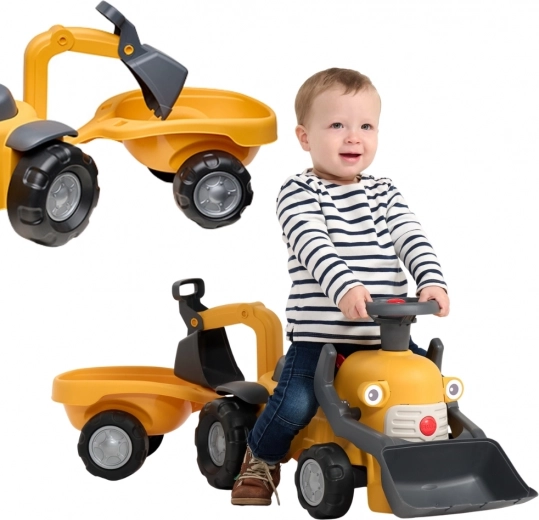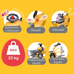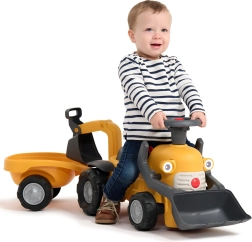 Otkrijte prvu kompaktnu guralicu s pravim funkcijama bagera koja spaja kretanje i igru uloga. Djeca će uživati u skupljanju i istresanju sitnica zahvaljujući prednjoj žlici, dok stražnja žlica odlično služi za utovar odvojive prikolice. Okretni volan s trubom, kliktajući ključ i skladište ispod sjedala jamče sate kreativne zabave.