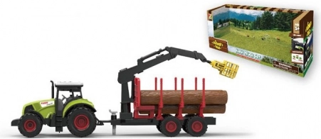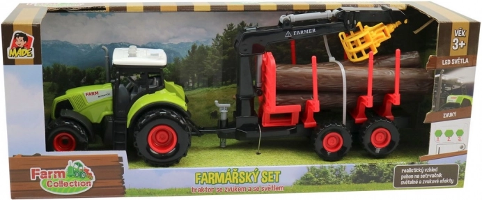 Zeleni traktor MaDe s prikolicom i krakom. Svjetlo i zvuk pritiskom na gumb, plastična konstrukcija, dimenzije 28,5 × 8,5 × 9 cm. Odličan poklon za male farmere.