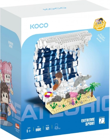 Konstrukcijski set KOCO Surfajući val s 1471 dijelom, dvjema minifiguricama i scenom s valom, dupinom i plažom. Kreativna zabava za djecu od 6 godina.