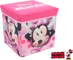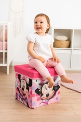 Stilska i praktična spremnica s poklopcem u dizajnu MINNIE MOUSE ujedno služi kao tabure za djecu. Ima čvrst poklopac s nosivošću do 80 kg, volumen 27 l i standardne dimenzije 30 × 30 × 30 cm. Lagan, sklopiv i idealan za dječju sobu, igraonicu ili kupaonicu.