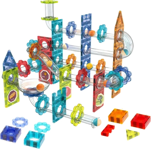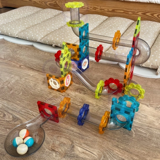 Set WOOPIE kombinira magnetne pločice s prozirnim elementima mramorne staze kako bi djeca mogla osmisliti i izgraditi bezbroj varijanti trasa. Zahvaljujući čvrstim spojima i kvalitetnim materijalima, konstrukcije su stabilne, dok kuglice glatko prolaze kroz rampe, zavoje, lijevke i tunele. Učenje fizikalnih principa prirodno se isprepliće s igrom.