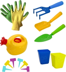 - kanta za zalijevanje u obliku cvijeta, vrtne rukavice, lopatica, lopata/šufla, grablje, 2 cvjetne posude (narančasta i žuta), 6 šarenih oznaka za biljke, torba za alat, zaštitna pregača s dinosaurima