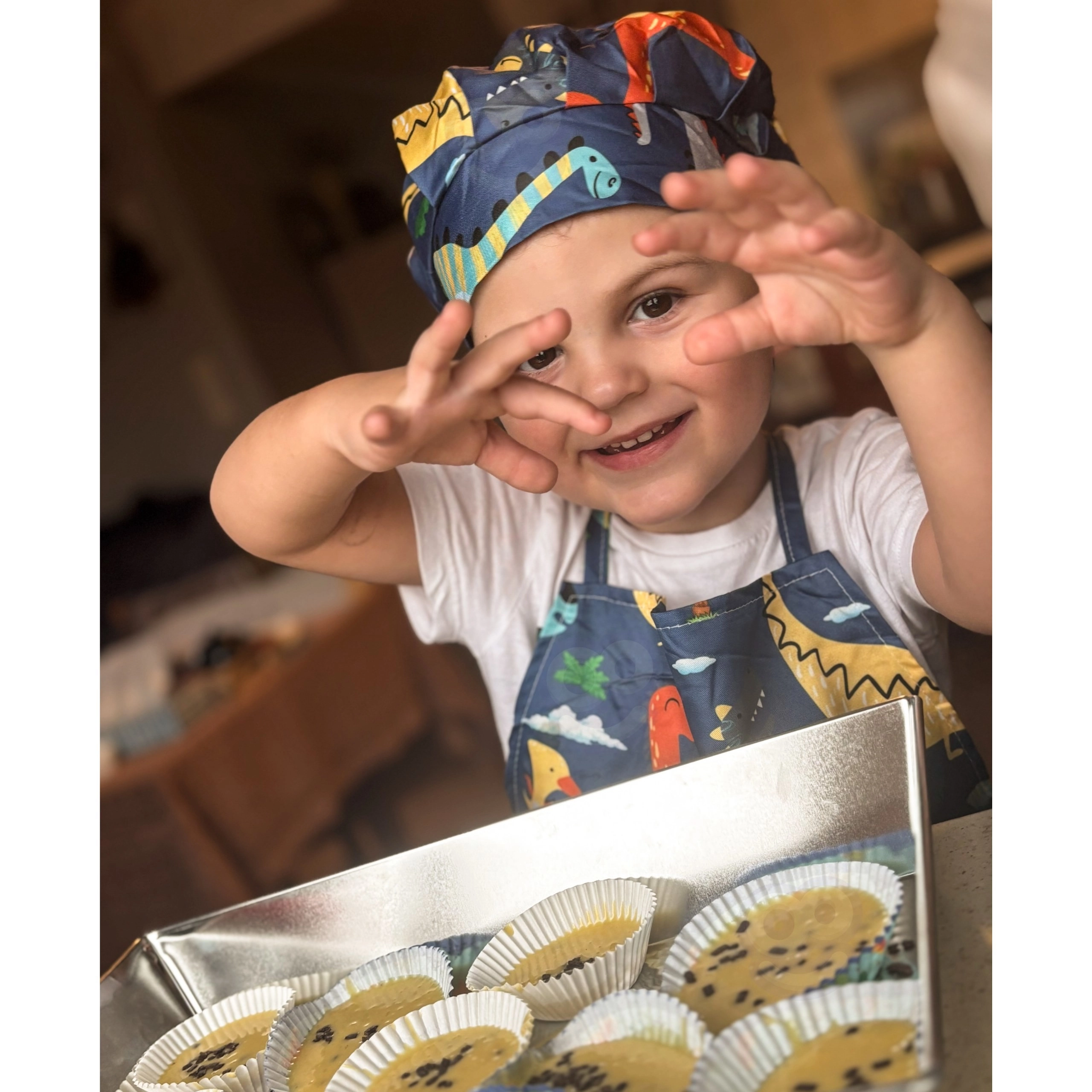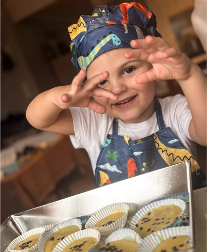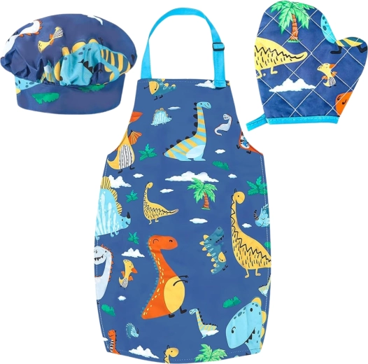 Pregača s podesivim vratnim remenom, kapa s elastičnom gumom i kuhinjska rukavica štite odjeću i ruke. Idealna veličina za djecu i jednostavno održavanje – pregaču i kapu moguće je prati u perilici rublja.