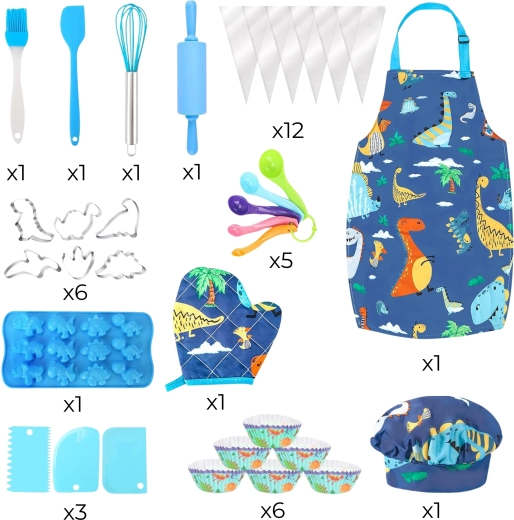 Pregača s regulacijom, kuharska kapa s gumom, kuhinjska rukavica, valjak, pjenjača, silikonska četkica, špatula, 5 mjernih žličica, 6 kalupa za kekse, 12 vrećica za ukrašavanje, 6 papirnatih košarica za muffine, 3 strugača za tijesto, silikonski kalup za mini dinosaure