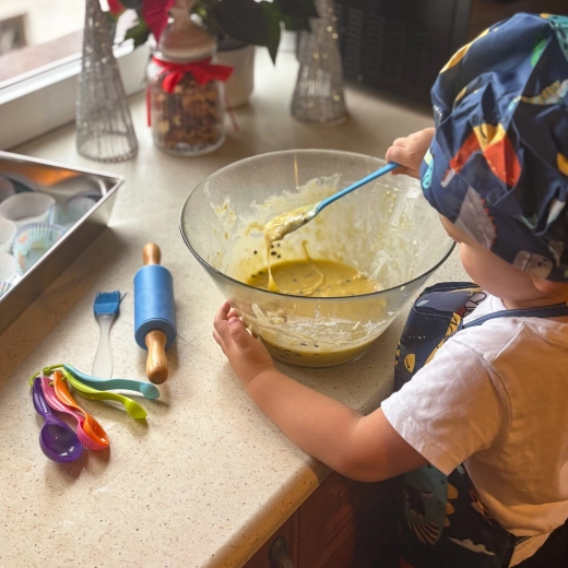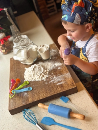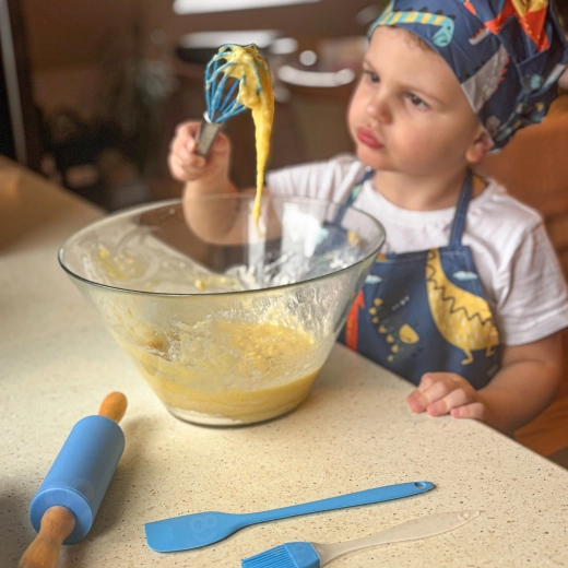 Lagani alati od materijala sigurnih za kontakt s hranom, silikonski elementi za jednostavno čišćenje i dječje dimenzije za bolji hvat i sigurnost pri radu.