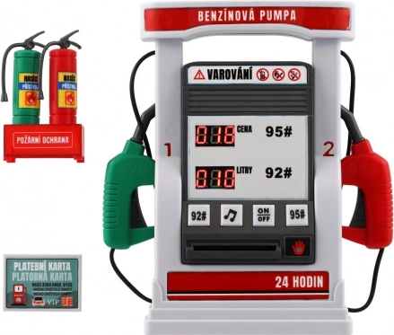 Dio seta su dva crijeva za točenje, platna kartica, vatrogasna oprema i dodatni pribor koji stvaraju realistično okruženje benzinske postaje. Kompaktno pakiranje idealno je za igru kod kuće i na putu.