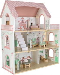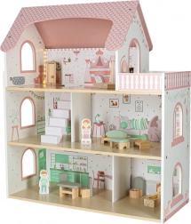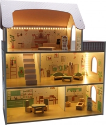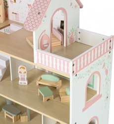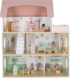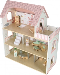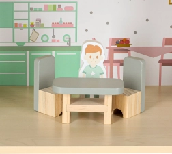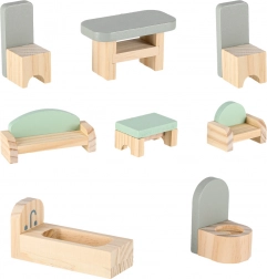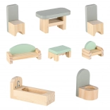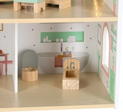 Uključeni su krevet, ormarić, sjedeća garnitura, stol sa stolicama i kupaonska oprema. Dvije drvene figurice potiču igru uloga i kreativnost.