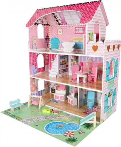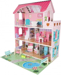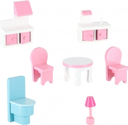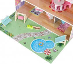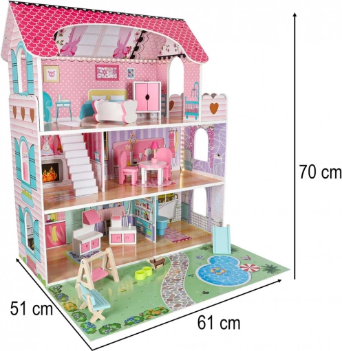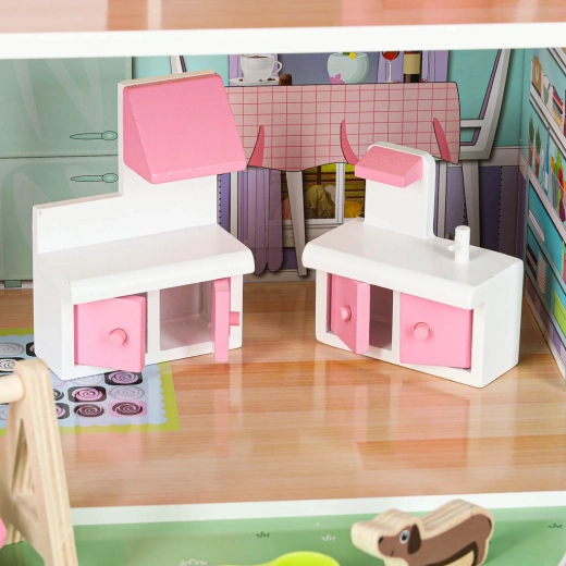 Bogata oprema uključuje stol, 2 stolice, ljuljačku, WC školjku, ležaljku, klupicu, dječji krevetić, lampu, zdjelicu za psića, ormar, štednjak i umivaonik te simpatičnu figuricu psića. Zahvaljujući robusnoj konstrukciji od MDF-a, plastičnim dodacima i metalnim vijcima, kućica je stabilna i otporna na svakodnevnu igru.