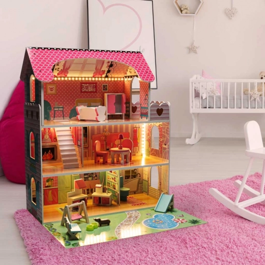 Kućica nudi 6 ugodnih zona: spavaću sobu, balkon, stubište, dnevni boravak, kuhinju i kupaonicu. Toplo LED trakasto osvjetljenje stvara prijatnu atmosferu pri igri i večernjem uspavljivanju. U kompletu je podloga s vrtom, gdje djeca pronalaze ljuljačku, klupicu i mjesto za odmor.