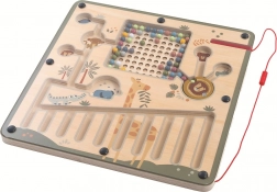 Ova drvena magnetična igraća ploča s preslatkim životinjama idealna je za igru kod kuće, u vrtiću i igraonicama. Djeca vode obojene kuglice urezanim stazama uz pomoć magnetske olovke pričvršćene vrpcom – slažu jednostavne slike prema 5 predložaka, pridružuju kuglice odgovarajućim životinjama i razvrstavaju ih u spremnike od najmanjeg do najvećeg.