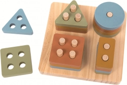 Ova kvalitetna drvena slagalica s navlačenjem nudi četiri osnovna oblika – kvadrat, trokut, krug i pravokutnik – u ugodnim bojama. Svaki oblik ima različit broj otvora, što djeci pomaže shvatiti princip razvrstavanja i logičkog razmišljanja. Pri namještanju dijelova na kolčiće djeca prirodno vježbaju hvat, preciznost pokreta i koncentraciju.