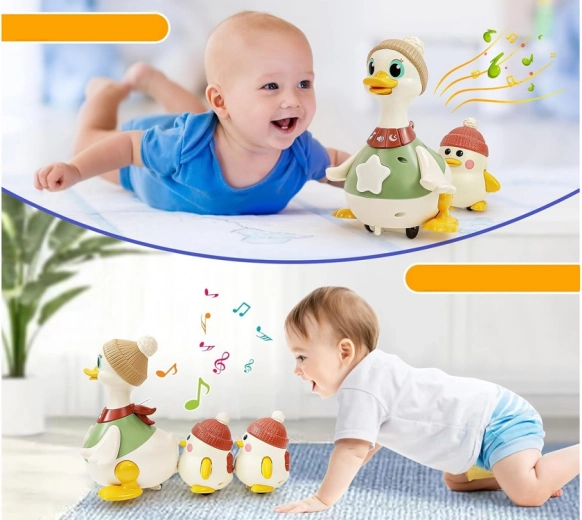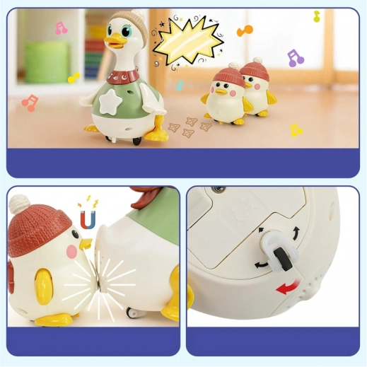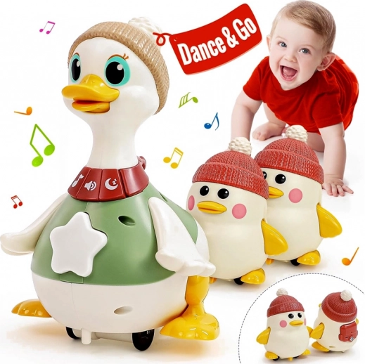 Otkrijte interaktivnu igračku koja potiče krupnu i finu motoriku, koordinaciju oko–ruka i razumijevanje uzroka i posljedice. Mama patka može sama hodati ili stajati i pjevati, pritom miče kljunom, a na trbuščiću joj svijetli nježna zvjezdica. Nakon dulje neaktivnosti sama se ugasi kako bi štedjela baterije.