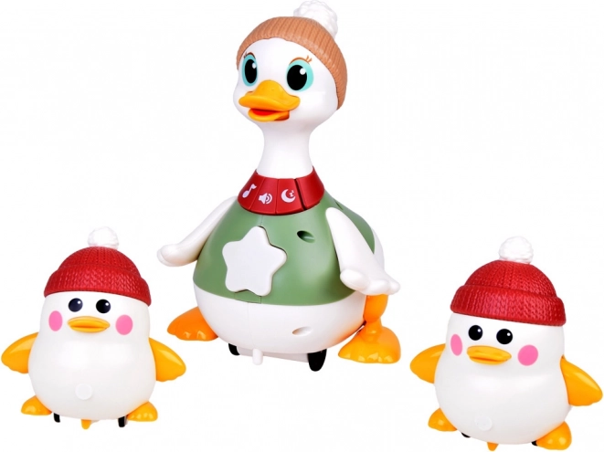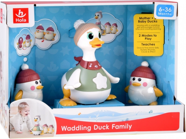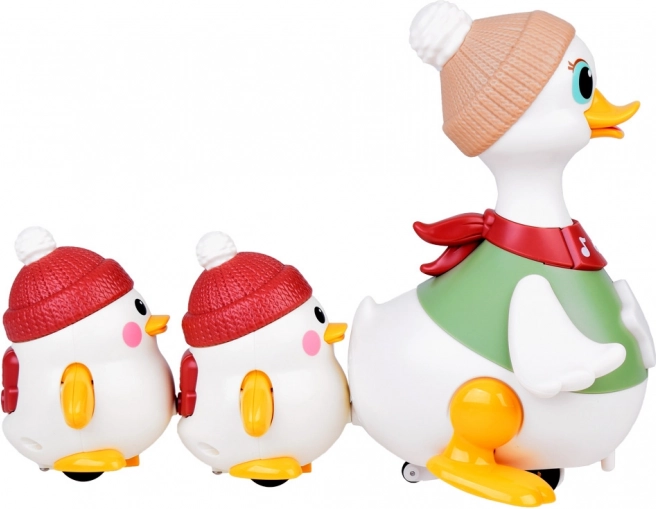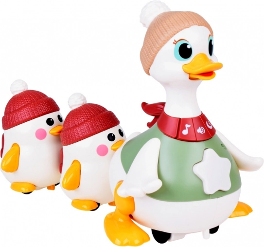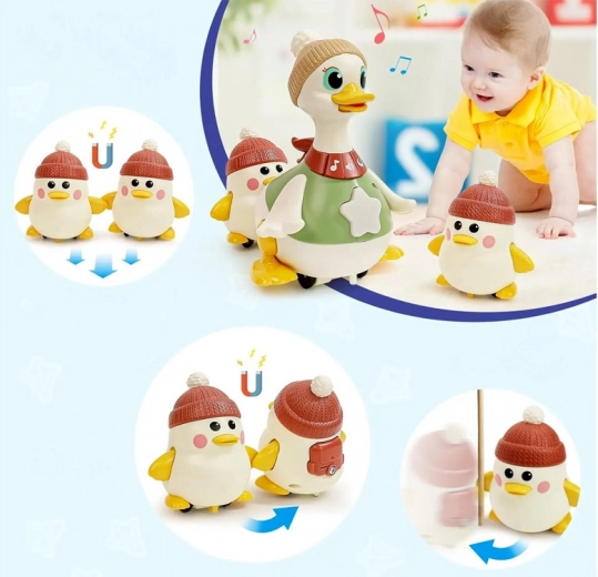 Preslatka obitelj pataka razveselit će mališane od 6 mjeseci. Mama patka s dvama pačićima kreće se na kotačićima, reproducira vesele melodije, ima svjetlosne efekte i pokretan kljun. Zahvaljujući magnetnom spoju pačići slijede mamu i tvore vlakić koji potiče djecu na puzanje, gmizanje i prve korake.
