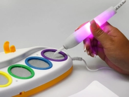 - Elektronički kist/stylus s LED-om, baza s obojenim podlogama, posebni papiri (cca 18 kom), držač za kist