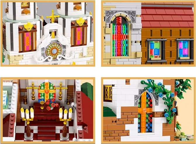 Dva tornja sa zlatnim križevima, ukrašeni portal, vitrajni prozori i promišljeni oltar s dekoracijama daju modelu autentičan izgled.