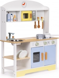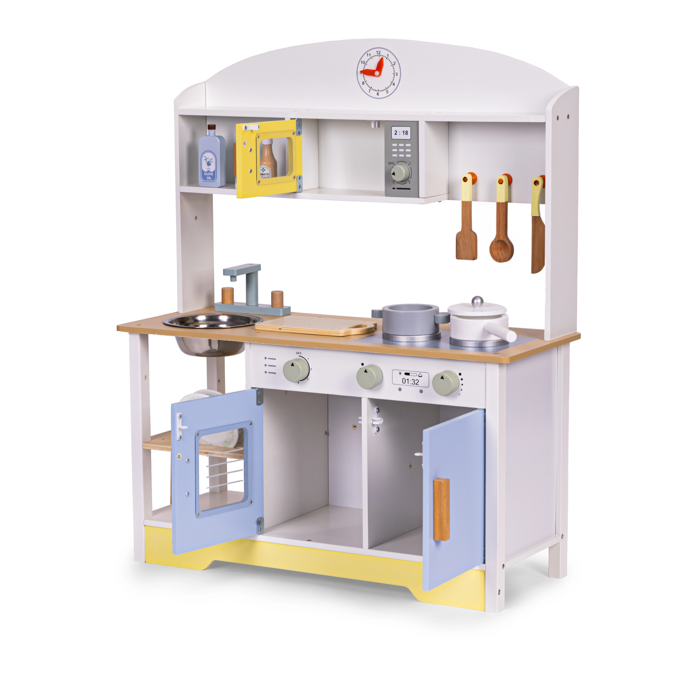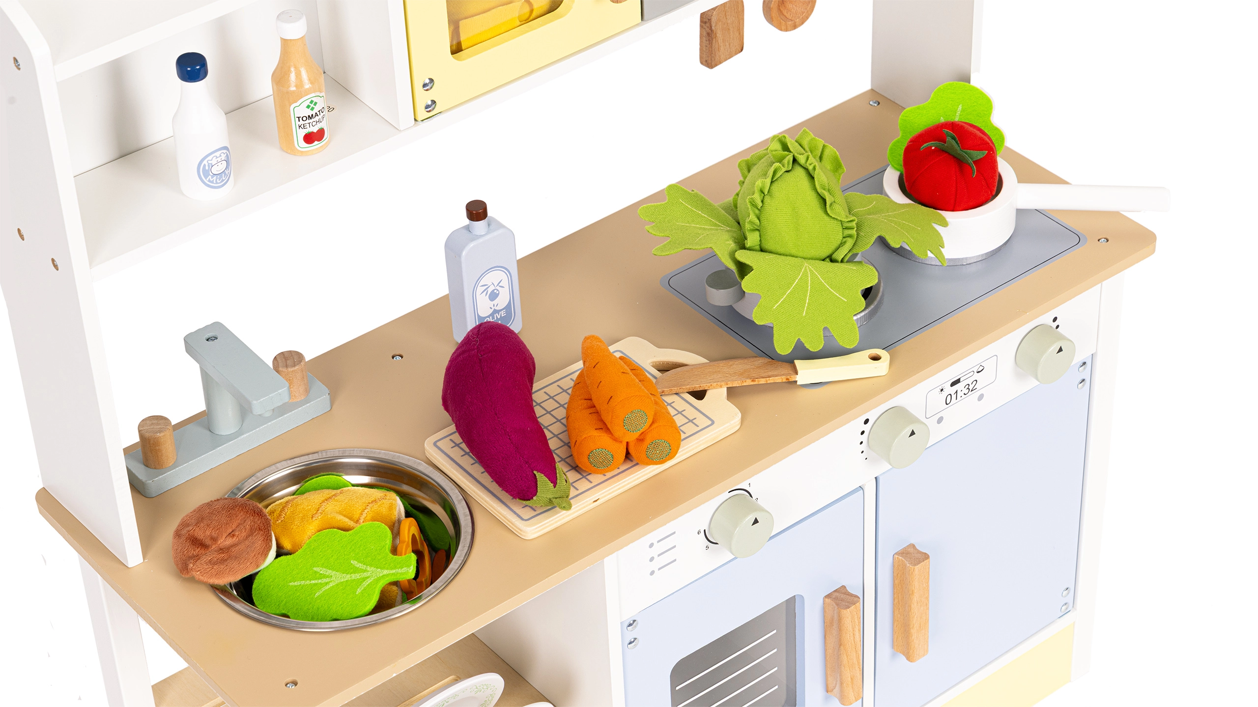 Zahvaljujući perilici s okretnim biračem, praktičnim ormarićima i policama te satovima s pomičnim kazaljkama, kuhinjica razvija finu motoriku, poimanje vremena i osjećaj odgovornosti. U kompletu je 12 drvenih dodataka – lonac, tava s poklopcem, tanjurići, pribor za jelo, daska i bočice “maslinovo ulje”, “kečap” i “mlijeko” – za igru bez čekanja.