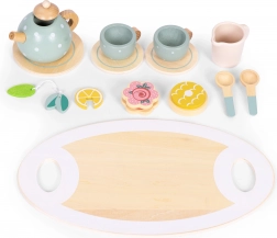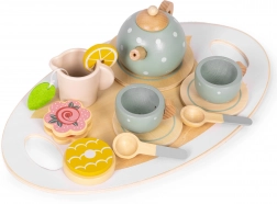 Stilski drveni čajni set s 14 dijelova idealan je dodatak dječjoj kuhinjici, dućanu ili kafiću. Svi elementi su od prirodnog drva sa zaobljenim rubovima za sigurno igranje, potiču maštu, suradnju i igranje uloga. U kompletu su poslužavnik, čajnik, šalice, tanjurići, žličice, vrč za mlijeko te dodaci poput kriške limuna, čajne vrećice i keksa.