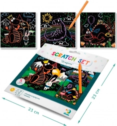Uz ovaj kreativni set DODO djeca će izgrebati šarene motive zmajeva po unaprijed nacrtanim linijama ili potpuno prema vlastitoj mašti. Svaki potez otkriva intenzivne boje koje od obične šablone stvaraju originalno umjetničko djelo.