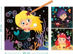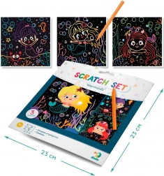 U pakiranju se nalaze tri kvadratne kartice dimenzija 20 × 20 cm i praktična olovka za struganje. Djeca mogu slijediti naznačene linije ili pustiti mašti na volju i stvoriti originalan morski svijet.