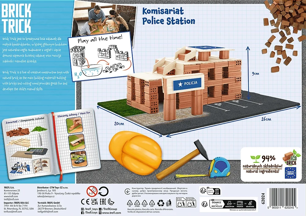 Sastavite detaljnu policijsku postaju od pravih glinenih ciglica i drvenih elemenata. Set nudi autentično građevinsko iskustvo – ciglu po ciglu, rezanje i lijepljenje letvica te završno ukrašavanje priloženim dekoracijama i papirnatim figuricama. Gotovu građevinu možete lako prepravljati i rastavljati zahvaljujući ljepilu koje se otapa u vodi.