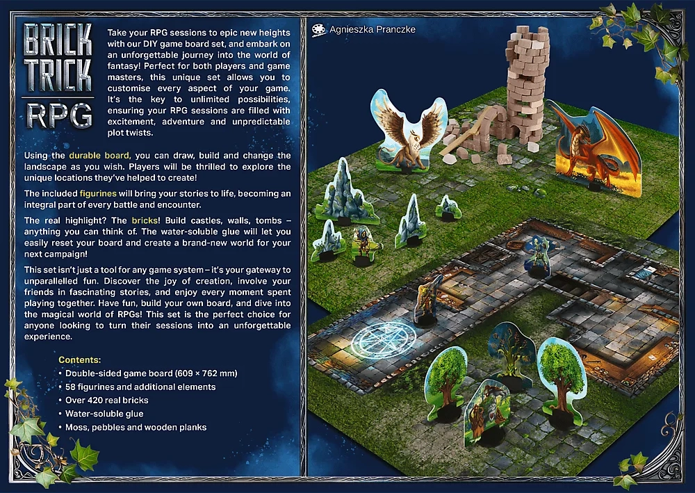 Set Trefl Brick Trick RPG: zaboravljeno nasljeđe XL donosi na stolne RPG igre realistično okruženje od pravih mini cigli. Zahvaljujući ljepilu topivom u vodi, građevine možete rastaviti i ponovno sastaviti – svaki put drugačije. Lako ćete stvoriti uvjerljive zidove, zidine, ruševine i tamnice te udahnuti svojim pričama jedinstvenu atmosferu.