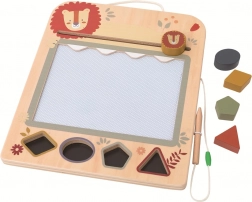 Drvena magnetična ploča s motivom lavića je zabavna i istovremeno edukativna igračka za djecu od 3 godine. Zahvaljujući magnetskoj olovci i četiri žigića djeca vježbaju finu motoriku, oko-ruka koordinaciju i kreativnost. Jednostavno brisanje jednim potezom bez nereda omogućuje crtanje iznova i iznova.
