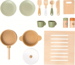 Dio seta je i bogata dodatna oprema: tanjuri, šalice, tava, lonac s poklopcem, sol i papar, daska za rezanje, kuhinjski pribor i rešetka za pećnicu. Konstrukcija od čvrstog drva i netoksičnih boja osigurava sigurnost i dug vijek trajanja.