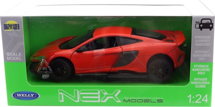 Detaljno izrađen metalno‑plastični model McLaren 675LT u mjerilu 1:24 oduševit će svakog zaljubljenika u supersportske automobile. Nudi otvarajuće karoserijske dijelove i lakiran je originalnim autolakom za realističan izgled. Idealan kao kolekcionarski komad ili poklon za djecu od 8 godina.