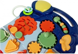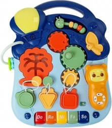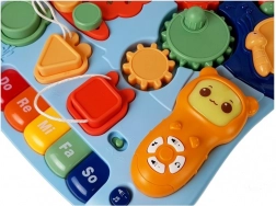 Okretni zupčanici, klizači, oblici na vrpcama i tipke za pritiskanje vježbaju hvat, koordinaciju oko–ruka i logičko razmišljanje.