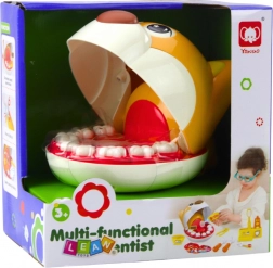 Zabavna i edukativna igračka koja djecu na razigran način upoznaje sa svijetom stomatologije. Zahvaljujući psećoj glavi s izvadivim zubima i bogatom opremom, mali zubari isprobaju čišćenje, pregled i liječenje. Osvijetljeno zrcalce, 8 izvadivih zubi i realistični instrumenti razvijaju finu motoriku, maštu i pravilne navike oralne higijene.