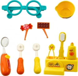 glava psića s 8 zubi, zubna četkica, bušilica, kliješta, zdjelica/„pljuvačnica“, mužar, bočice s lijekovima, tubica s izvlačivom pastom, oznake (čokolada, bombon), stalak za dodatke, osvijetljeno zrcalce, naočale