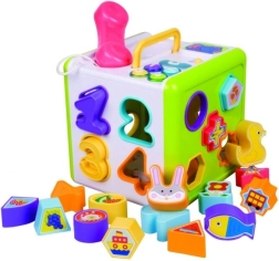 Ova umetnička je idealna za najmlađu djecu zahvaljujući svojim živopisnim bojama i različitim oblicima za umetanje. Na svakoj strani kocke nalaze se otvori namijenjeni za umetanje oblika, slova i brojeva, što djecu motivira na učenje i igru dok otkrivaju svijet oko sebe.
